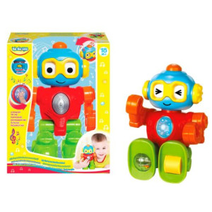 Игрушка интерактивная 'Мой Первый Робот'. Двигает руками и ногами (с приятным 'треском'). Меняет выражение глаз (4 эмоции) при нажатии кнопки на голове или вращении боковых роликов. Оснащен яркими световыми и разнообразными звуковыми эффектами.