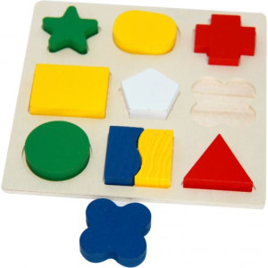 Игра 'Геометрика: Фигуры', деревянная. 9 геометрических фигур и 9 отверстий соответствующей формы. Ребенок сможет изучать не только фигуру, но еще и цвета, параллельно развивая логику, сообразительность и внимательность