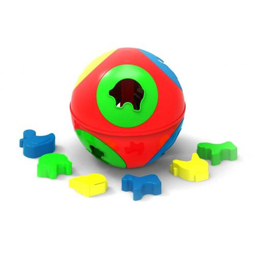 Шар-сортер. Состоит из двух основных составляющих – это емкость с отверстиями разной формы и размера, а также несколько фигурок-вкладышей (6 животных) , каждая из которых соответствует какому-то одному отверстию.