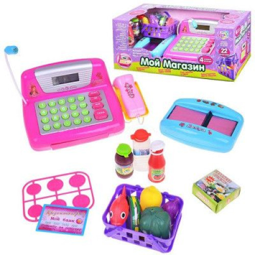 Яркий пластиковый кассовый аппарат. Имеет экран, настоящий встроенный калькулятор, сканер для кредиток, рабочий сканер для продуктов (считывает штрих-код), рабочий микрофон и открывающуюся кассу. Оснащён звуковыми и световыми эффектами (звуки работы кассы и сканера, кнопки на кассе с озвучкой на русском языке). Также в наборе есть магнитная лента, продуктовая корзина, деньги (купюры и монеты), кредитка, и различные продукты (9 шт).