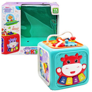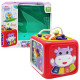 Многофункциональный куб на каждой стороне которого можно найти увлекательные, развивающие игры и другие развлечения, которые так увлекают малышей и помогают в развитии моторики, зрительной координации и слуха. На гранях куба можно найти веселые часы с вращающимися стрелками, сортеры, музыкальные клавиши, лабиринт, симуляция руля и возможность послушать веселые детские песни и мелодии. Размер игрушки: 12х15х12 см.