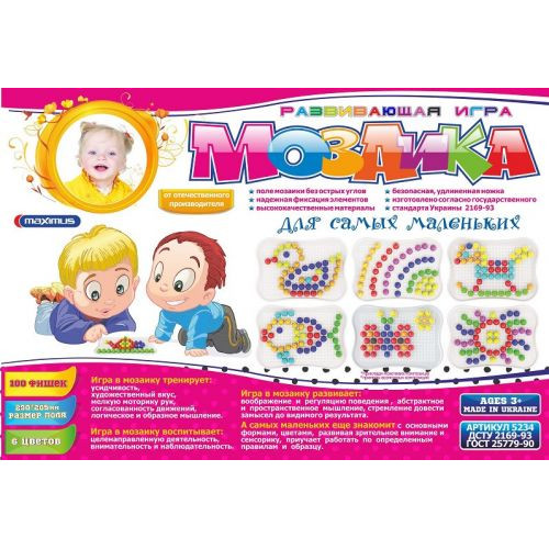 Мозаика, 100 крупных деталей, 6 цветов. Размер детали - 2 х 3 см. Размер игрового поля - 29 х 20,5 см. Развивает воображение, абстрактное и пространственное мышление.