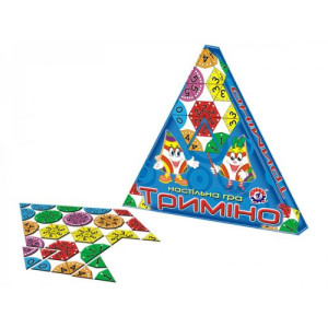 Тримино (треугольное домино). Принцип совмещения костяшек другой: в Тримино необходимо, чтобы совпали два числа, расположенные на соединяемых сторонах костяшек