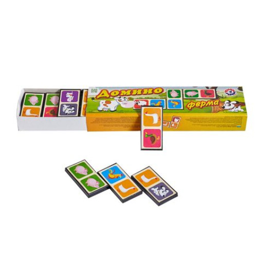 Домино 'Ферма'. Играют от 2-х до 4-х человек. Игроки должны положить фишку (кость), где есть наличие подходящего животного. Если такового нет, следует вытянуть карточку из 'резерва'. Выигрывает тот, кто завершает выкладку своих фишек (костей).