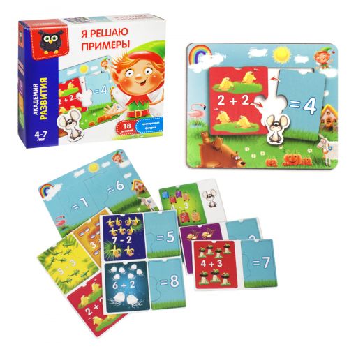 Игра развивающая 'Я решаю примеры' поможет развивать логическое мышление. Состоит набор из 18 деталей, из которых можно собрать пример. Для детей 4-7 лет.