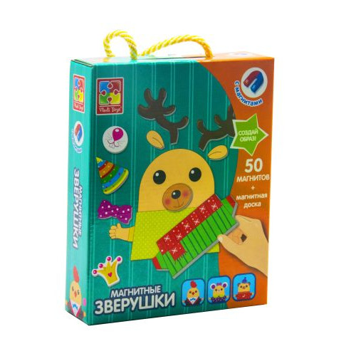 Суть игры состоит в том, чтобы на магнитной доске (22 х 16 см) менять и комбинировать различные части мордашек и аксессуары, создавая каждый раз уникальную зверушку. 50 магнитов в наборе. Также в комплекте есть книжечка с примерами животных, их описанием и заданиями.