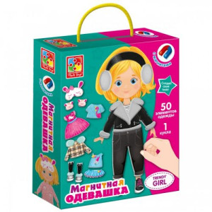 Увлекательная игра - магнитная одевашка. В комплекте есть картонная фигурка куклы и 50 элементов одежды, с помощью которых можно создавать свои оригинальные образы. Все детали оснащены магнитной основой, благодаря чему одежда держится на кукле. Размер куклы: 21 х 10 см. Набор изготовлен из качественных и безопасных материалов. Для детей от 3-х лет.