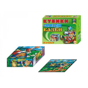 Настольная игра (кубики + пазлы). В наборе 12 кубиков на гранях которых изображены сюжеты из известных сказок и 12 пазлов из которых можно сложить 1 сюжет из сказки.