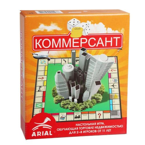 Суть настольной игры 'Коммерсант' похожа на игру 'Монополия'. Игра предназначена для 2-8 игроков, возрастом от 11-ти лет. Коммерсант - классическая экономическая игра, обучающая торговле недвижимостью, дающая возможность распоряжаться большими деньгами и быстро обогатиться. Покупайте и продавайте недвижимость, строя 'Дома' и 'Отели'. Следите за другими игроками, которые останавливаются на Ваших участках недвижимости - они обязаны платить Вам арендную плату! Не забывайте получать 200 тысяч каждый раз, когда пересекаете 'Старт'. Ваш успех зависит от выгодных сделок и продуманных капиталовложений.