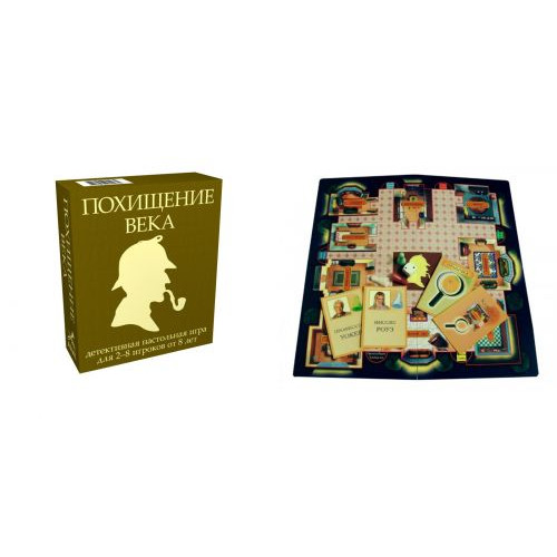 Настольная игра 'Похищение века'.В этой игре каждому мгроку придется, при помощи дедуктивного метода, собрать и проанализировать вещественные доказательства, чтобы раскрыть запутанное ограбление. Шесть героев (подозреваемых), шесть вещественных доказательств, оставленных кем-то в доме, девять комнат. Передвигаясь по игровому полю, игрокам нужно выдвигать свои версии. Только логика и внимание во время игры помогут одному из детективовраспутать это преступление.
