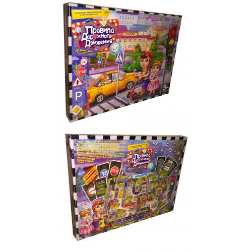 Настольная игра 'Правила дорожного движения' 2 в 1. Два варианта игры: 1) Увлекательная прогулка пешеходов; 2) Путешествие на автомобиле. Цель игры: первым дойти до финиша. Так же в состав игры добавлена игра-викторина 'Дорожные знаки', которая не только приоткроет мир знаний об основных дорожных знаках, но и добавит интригу в определении победителя.
