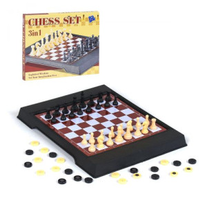 Игровой набор '2 в 1'. В наборе есть 2 игры: шашки и шахматы. Доска с металлическим покрытием. Фигуры выполнены из пластика и оснащены магнитом, что фиксирует фигуру на игровом поле. Выполнен из качественных и безопасных материалов.
