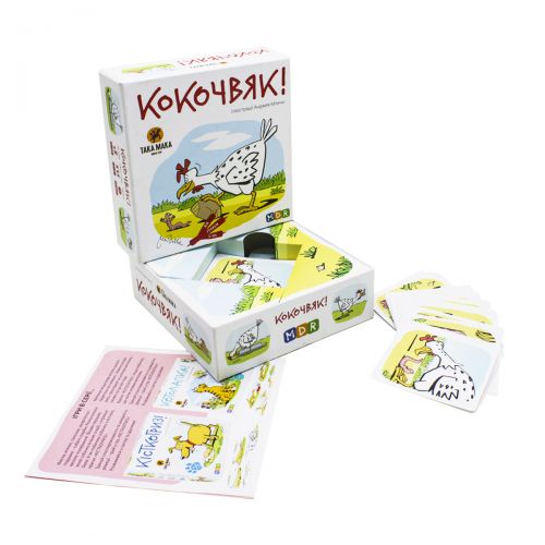 Веселая настольная игра 'Кокочвяк'. Червячки захватили целый двор и курочка уже не справляется с ними. Помогите курочке собрать червячков, кричи 'Кокочвяк' и собирай все карточки со стола. Тренируй наблюдательность и быстроту реакции играя в игру 'Кокочвяк'. Подходит для развлечений с друзьями и семьей. В наборе 59 карточек. Игра для 2-6 человек, возрастом от 5 лет.