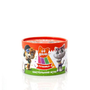 Игра в тубусе '44 Кота. Путаница'. Игра в тубусе 'Путаница Смешарики' (аналог игры Дуплет или Дабл). Игровой процес построен на поиске совпадений. Картинки разделены на группы. В каждой группе есть одна картинка, совпадающая с картинкой на другой карточке из колоды. Цель игры - найти карточку с совпадающей картинкой, произнести вслух, что на ней нарисовано и забрать себе, как победный трофей. 35 фишек.