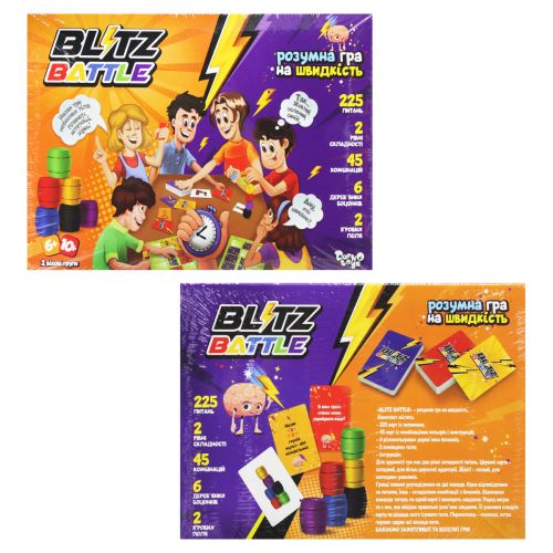 Настольная игра 'Blitz Battle'. Правила игры: игроки делятся на 2 команды. Одновременно участники команд тянут по одной карточке и выполняют задание / отвечают на вопрос. Выигрывает раунд та команда, которая справится с заданием быстрее. В комплекте: 225 карт с вопросами, 45 карт с комбинациями цветов и конструкций, 6 деревянных бочоночков, 2 командных поля, правила игры.