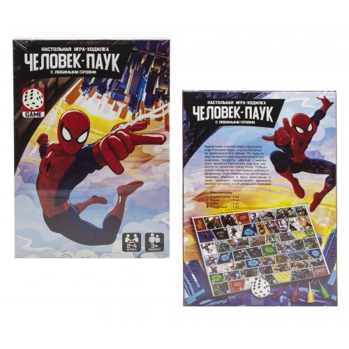 Настольная игра 'Человек паук'. Бросая кубик и делая ходы в красочной игре, игроки постепенно приближаются к победе. По пути их ждут увлекательные приключения и неожиданные повороты событий - иногда даже придется пропустить ход или вернутся на несколько шагов назад. Победителем считается тот, кто первым доберется до финиша.