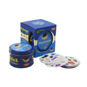 Настольная игра 'Дуплет Deluxe'. Игровой процес построен на поиске совпадений. Картинки разделены на группы. В каждой группе есть одна картинка, совпадающая с картинкой на другой карточке из колоды. Цель игры - найти карточку с совпадающей картинкой, произнести вслух, что на ней нарисовано и забрать себе, как победный трофей. 57 круглых карточек. В металлической баночке.