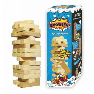 Настольная игра 'Джанга'. 54 деревянных брусочков. Бруски выкладываются горизонтально, по три штуки в ряд, чередуясь в двух направлениях - ряд вдоль, ряд поперек. Необходимо вытащить брусочек снизу или середины башни и установить его сверху, при этом не обрушив строение. Проигрывает тот, на чьем ходу башенка упадет.