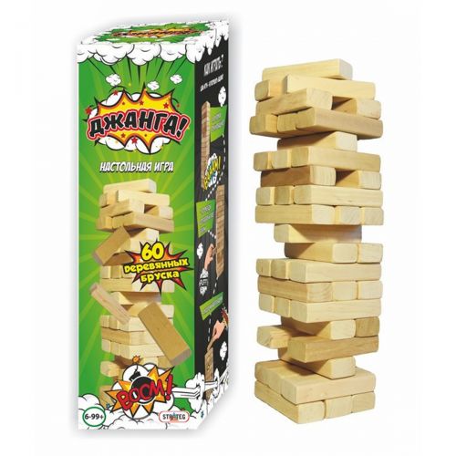 Настольная игра 'Джанга'. 60 деревянных брусков. Бруски выкладываются горизонтально, по три штуки в ряд, чередуясь в двух направлениях - ряд вдоль, ряд поперек. Необходимо вытащить брусочек снизу или середины башни и установить его сверху, при этом не обрушив строение. Проигрывает тот, на чьем ходу башенка упадет.