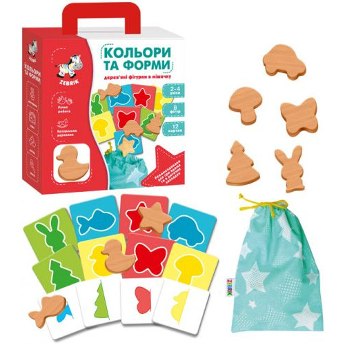 Набор состоит из фигур в разных видах: деревянные брусочки, цветные карточки, карточки с контурами и половинами фигур. Различные варианты игры - назови цвета карточек, отыщи форму, которая спряталась, подбери фигуру по контуру, выбери карточку с фигурой и найди на ощупь в мешочке деревянный брусок нужной формы.