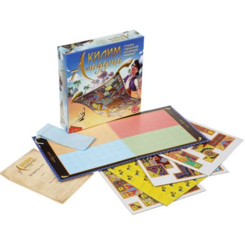 Настольная игра 'Ковер Аладдина' подходит для игроков разных возрастов. Нужно из кусочков 'сшить' волшебный ковер для Аладдина. Игроки заполняют расчерченное поле кусочками (правила схожи с игрой 'Лото'). Для детей от 7 лет.