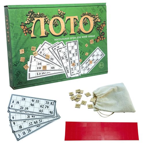 Настольная игра 'Лото'. Ведущий вынимает по одной плашки из мешочка и объявляет цифру. Игроки следят за цифрами на своих карточках. Если цифра (цифры) совпадает с названной, игрок накрывает ее фишкой. Победителем становится тот, кто первым накроет все цифры на карточке. В игре могут принимать участие до 12 человек от 6 лет.
