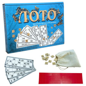 Настольная игра 'Лото'. Ведущий вынимает по одной плашки из мешочка и объявляет цифру. Игроки следят за цифрами на своих карточках. Если цифра (цифры) совпадает с названной, игрок накрывает ее фишкой. Победителем становится тот, кто первым накроет все цифры на карточке. В игре могут принимать участие до 12 человек от 6 лет.