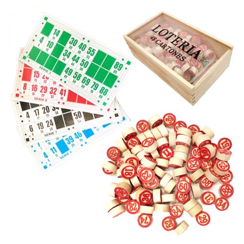 Настольная игра 'Лото'. Ведущий вынимает по одной фишке из мешочка и объявляет цифру. Игроки следят за цифрами на своих карточках. Если цифра (цифры) совпадает с названной, игрок накрывает ее фишкой. Победителем становится тот, кто первым накроет все цифры на карточке. В игре могут принимать участие до 12 человек от 6 лет. Упакован набор в деревянную коробочку.