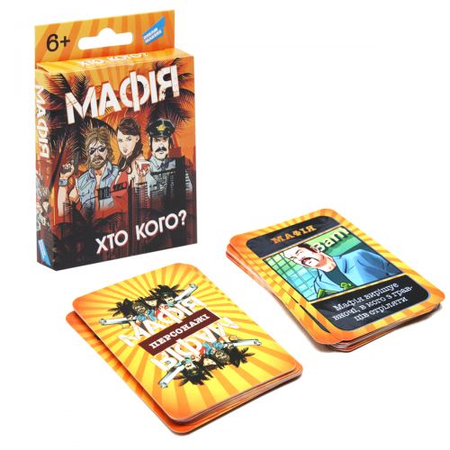 'Мафия' - командная интеллектуальная игра, что моделирует вечное противостояние Мафии и мирных жителей. Рассчитана на 6-20 игроков от 6 лет. 30 карточек в комплекте.