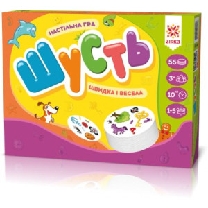 Настольная игра 'Шусть' предназначена для 1-5 игроков, возрастом от 5-ти лет и занимает 10 минут. 'Шусть' - игра на быструю реакцию, в которой все участники играют одновременно. Она в простой форме развивает наблюдательность, задействует не только двигательную активность и мышление, а и речь игроков. В комплекте: 55 карточек с изображениями и инструкция. На каждой карточке по 8 изображений и только одно из них совпадает с изображением на другой карточке. Необходимо найти два одинаковых изображения на своей карточке и карточке, что лежит на столе.