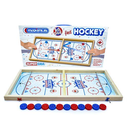Настольная игра 'Быстрый хоккей' (Fast Sling Puck). Игра представляет собой мини версию настольного хоккея. Игра будет интересная всем, от маленьких до взрослых. Тренирует меткость и координацию движений. Простые правила игры: с помощью резинки, перебить через 'ворота' все шайбы на поле соперника. Выполнено из крепкой, отшлифованной древесины. Поле покрыто защитным слоем.
