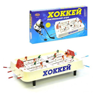 Настольная игра 'Хоккей'. Тяните специальные штыри вперед и назад, чтобы Ваши игроки двигались, отбивая шайбу от ворот. По 6 игроков в каждой команде.