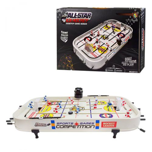 Настольная игра 'Хоккей' - отличный вариант проведения досуга с семьей.В наборе есть все необходимое для игры: игровое поле 29х53 см., которое крепится к столу; фигурки игроков, шайбы, ворота. Поле и персонажи выполнены из пластика, рычаги, на которые крепятся игроки- металлические. Для детей от 3-х лет.