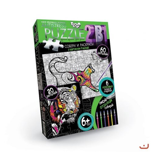 Пазл-раскраска 'Антистресс'. Набор включает 2 картинки-пазла из 20 и 60 деталей соответственно. Собери и раскрась пазлы. 6 неоновых гелиевых стержней разных цветов в комплекте.