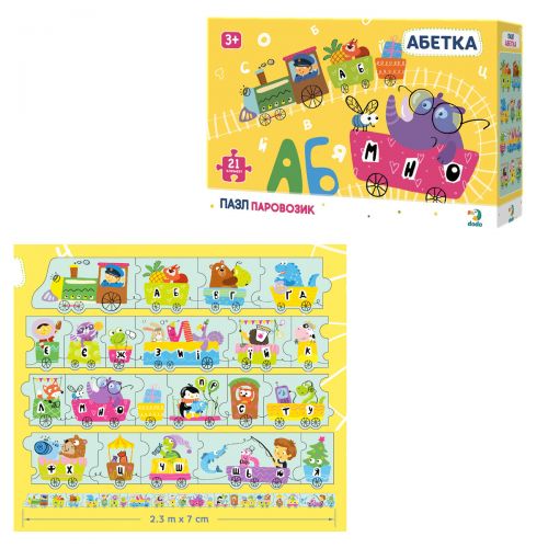 Пазл Vladi Toys Азбука: ПаровозикПазл 'Азбука: Паровозик'. Набор состоит из 21 элемента, которые последовательно соединяются в длинный поезд (2,3 метра). На каждом элементе - животное или предмет, название которого начинается на одну из букв украинского алфавита.