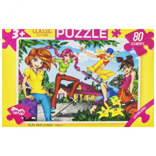 Яркие красочные пазлы на 80 элементов, с изображением сказочных персонажей. Размер готовой картинки: 23 х 16,5 см.