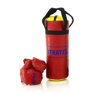 Груша изготовлена из прочного кожзама и наполнена спрессованными опилками. Имеет специальное крепление, чтобы подвешивать грушу. Форма перчаток стандартная, с наполнителем и шнуровкой, выполнены из кожзама. Высота 46 см, диаметр 18 см.