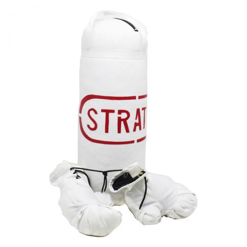 Груша изготовлена из прочного кожзама и наполнена спрессованными опилками. Имеет специальное крепление, чтобы подвешивать грушу. Форма перчаток стандартная, с наполнителем и шнуровкой, выполнены из кожзама. Высота 46 см, диаметр 18 см.