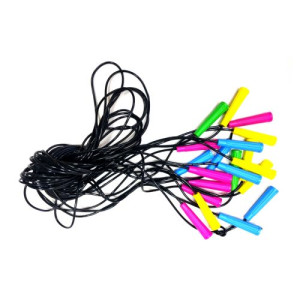Резиновая скакалка с цветными пластиковыми ручками. Длина скакалки: 2,8 м. Разные цвета в ассортименте. Цена за 1 штуку.