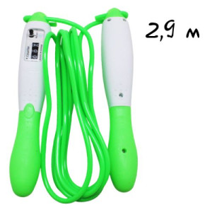 Резиновая цветная скакалка с пластиковыми ручками. Длина скакалки: 2,9 м. На ручке расположен встроенный счетчик прыжков.