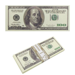 Интересный набор - пачка сувенирных денег. Номинал купюр по 100 долларов, в пачке приблизительно 80-100 купюр. Высокая детализация игровых денег, прочная бумага.
