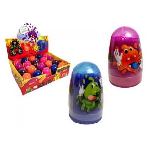 Состоит из вязкого материала, который можно растягивать, сжимать и надувать. Может прыгать как настоящий попрыгунчик. Приятный на ощупь, разные цвета. Цена за одну баночку (20 в коробке).