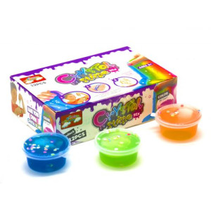 Слайм с легкостью растягивается в разные стороны, а его гладкая яркая поверхность не оставляет следов и не липнет к рукам и одежде, растягивается и надувается. В наборе 12 ярких цветов с кофетти. Каждый слайм хранится в индивидуальной баночке.