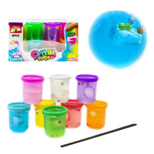 Слайм с легкостью растягивается в разные стороны, а его гладкая яркая поверхность не оставляет следов и не липнет к рукам и одежде, растягивается и надувается. В наборе 8 ярких цветов с бусинками. Каждый слайм хранится в индивидуальной баночке.