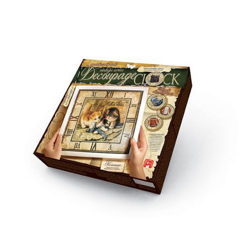 Набор для творчества 'Decoupage Clock' Котята. Создай настенные часы в технике декупаж. Декупа́ж — техника декорирования различных предметов, основанная на присоединении рисунка, картины или орнамента к предмету и далее покрытии полученной композиции лаком ради сохранности, долговечности и особенного визуального эффекта. В наборе: декупажная карта, заготовка для часов, часовой механизм, фактурная губка, акриловая краска, багетная рамка, акриловый лак, клей ПВА, пошаговая инструкция. Готовые часы вставляем в рамку 30 х 30 см и вешаем на стену.