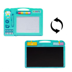 Двухсторонняя пластиковая доска для рисования магнитной основой с одной стороны и мелками с другой. В наборе: магнитная ручка, печати, мелки и губка. На доске предусмотрены счеты и колесико с цифрами для изучения математики. Готовый рисунок можно стереть, потянув за бегунок внизу доски. Размер поля для рисования - 13 х 18 см.