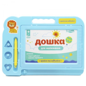Яркая пластиковая доска для рисования с магнитной основой. В наборе: магнитная ручка и 3 печати (в форме сердца, круглая, треугольная). Готовый рисунок можно стереть, потянув за бегунок внизу доски. Размер поля для рисования - 17 х 11 см.