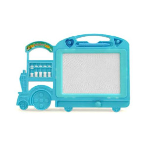 Яркая пластиковая доска для рисования в форме паровозика. Имеет магнитную основу. В наборе: магнитная ручка и 2 печати (в форме сердца и треугольная). Готовый рисунок можно стереть, потянув за бегунок внизу доски. Слева на доске такжес счёты.