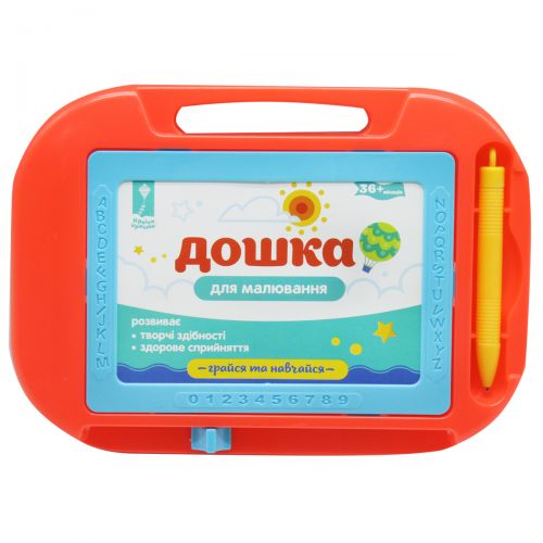 Яркая пластиковая дощечка для рисования. Имеет магнитную основу. В наборе: магнитная ручка, дощечка. Готовый рисунок можно стереть, потянув за бегунок внизу доски.