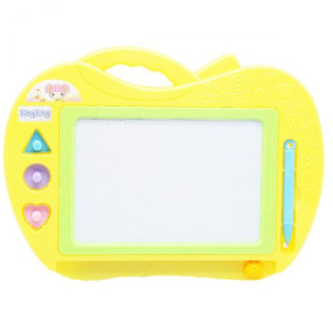 Яркая пластиковая доска для рисования с магнитной основой. В наборе: магнитная ручка и 3 печати (в форме сердца, круглая, треугольная). Готовый рисунок можно стереть, потянув за бегунок внизу доски. Размер поля для рисования - 17,5 х 11 см.